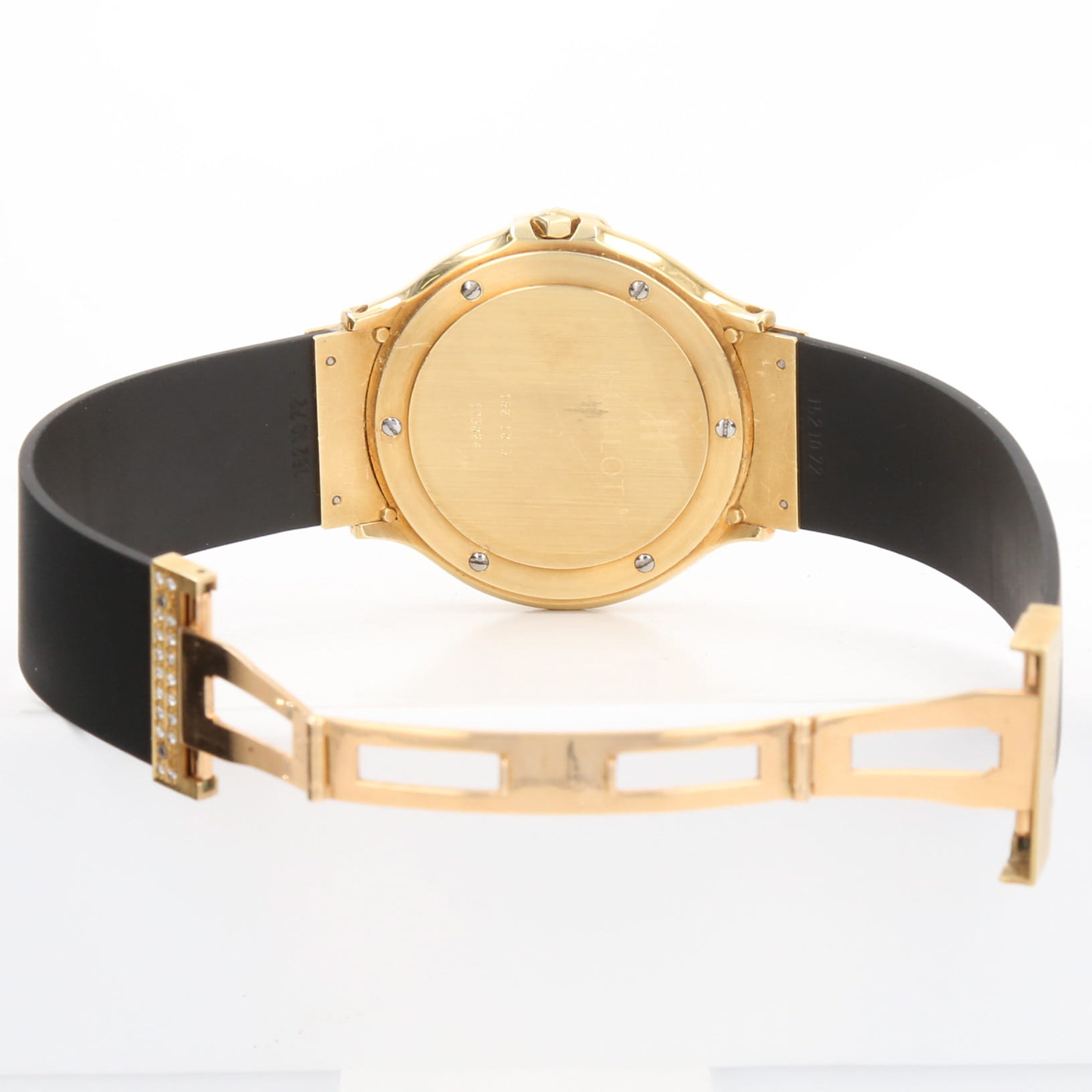 Dây đeo cao su đen với khóa gập đôi bằng vàng vàng 750/18 carat được đính 36 viên kim cương cắt brilliant hiện đại chất lượng hàng đầu của Wesselton, mỗi viên nặng 0,01 carat, tổng trọng lượng 0,036 carat.